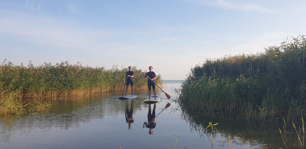 Absoluter Stresskiller ist eine Tour auf einem der großen Stand Up Paddle Boards, die man sich an der Windsurfschule beim Café Knatter ausleihen kann. Beim lautlosen Dahingleiten auf dem Achterwasser, fällt innerhalb kürzester Zeit aller Stress ab. Die Gedanken kommen zur Ruhe. Die Strahlen der untergehenden Sonne spiegeln sich auf der blitzblanken Wasseroberfläche, während über und unter dem Board die Schäfchenwolken dahinziehen. Einfach nur sein, das Glück spüren und die Welt aus einem anderen Blickwinkel wahrnehmen.
