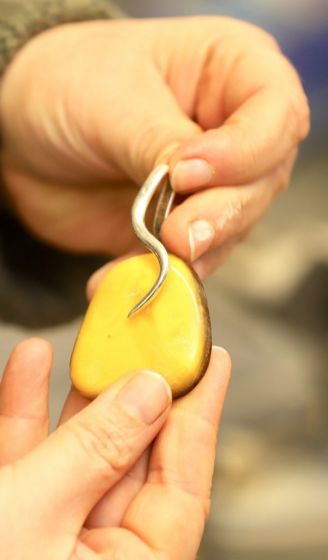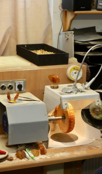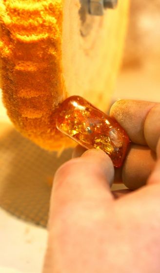 Matthias Hengstler verwendet nur Naturbernstein. Er liebt seine Farbe, seine Beschaffenheit und die Herausforderung, ihn zu bearbeiten. Aus ihnen stellt er Ringe, Ketten oder Anhänger her. Dafür schleift und poliert Hengstler den Stein mit seinen drei Maschinen, bis er funkelt. Zunächst mit einem groben Schleifblatt, später mit immer feineren. Der dabei freigesetzte Bernsteinstaub duftet wunderbar nach Harz und ätherischen Ölen.