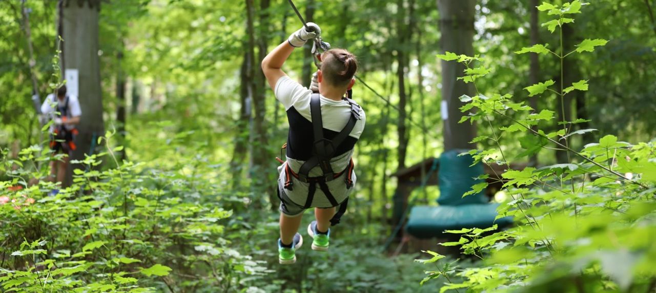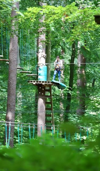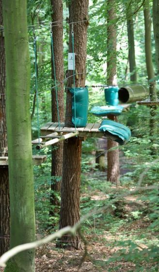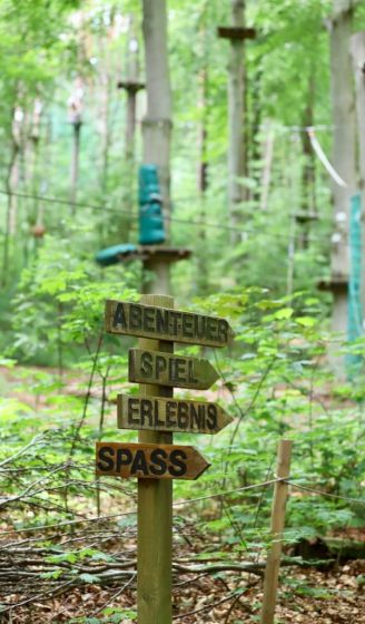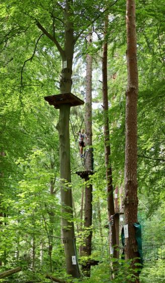 Doch auch Flachlandfans und Bodenatmer können ohne Schwindelgefühl in gefälliger Höhe das Klettern erproben, bevor sie sich auf das nächsthöhere Baumlevel schwingen. Denn der Kletterwald hat je nach Anspruch und Zutrauen insgesamt sechs verschiedene Parcours im Angebot. Den Spiel- und Spaßparcours in einem Meter Höhe können auch Menschen mit einer Beeinträchtigung gut händeln. Schwindelfreie Abenteurer können bis in die höchsten Gipfel klettern und den legendären Tarzansprung wagen. Passieren kann nichts. Denn jeder Kraxler sei mit zwei Karabinern am Sicherheitsseil eingehakt.