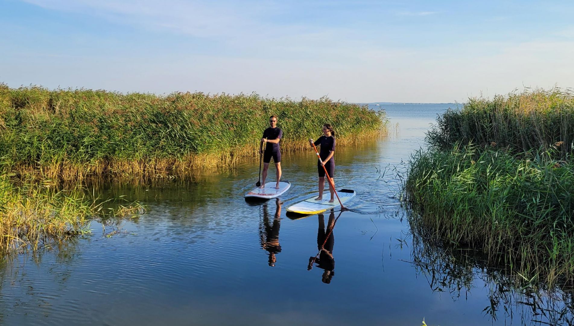 Wer kein SUP-Board hat, kann sich ein solches u.a. an der Windsurfschule beim Café Knatter ausleihen. Direkt am Achterwasser gelegen, gibt es weit und breit keinen besseren Spot, um im weiten „Stehrevier“ entspannt erste SUP-Erfahrungen zu sammeln.