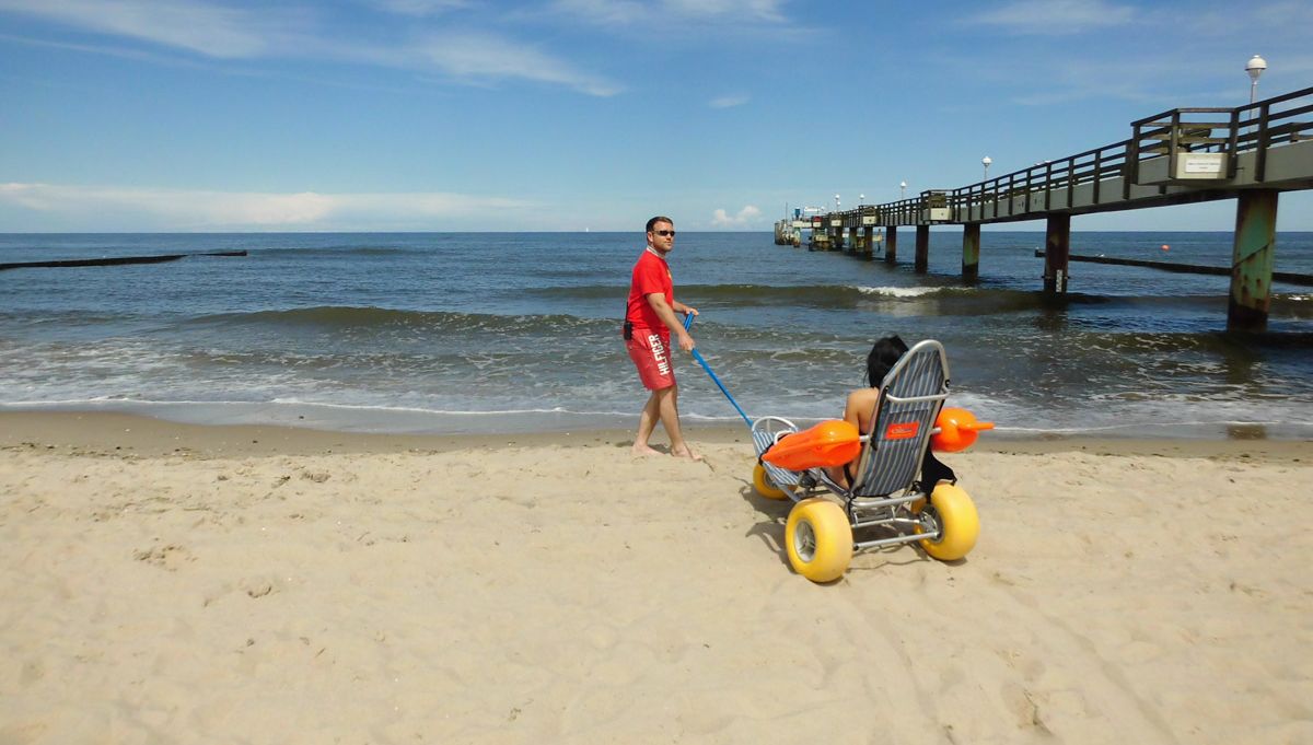 Mittels eines Strandrollstuhls ist selbst das Abtauchen in die kühlende Ostsee möglich. Dieser kann kostenfrei bei den Rettungsschwimmern in Koserow oder am Strandkorbverleih am Strandabgang 4X in Ückeritz ausgeliehen werden.