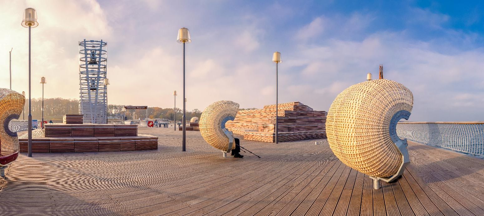 Was für eine Sinfonie aus Architektur, Farben, Licht, Holz und Meer! Unter den fünf Seebrücken Usedoms, so sagen unsere Gäste, gehört sie mit zu den schönsten. Die Welle über den Wellen wurde 2021 eröffnet und schlängelt sich fast 300 Meter in die Ostsee hinein. Die komplett barrierefreie Seebrücke mit Schiffsanleger und Glockenturm bietet zwei große Plattformen zum Sitzen, Genießen und Relaxen – Sonnenuntergangskino inklusive.
